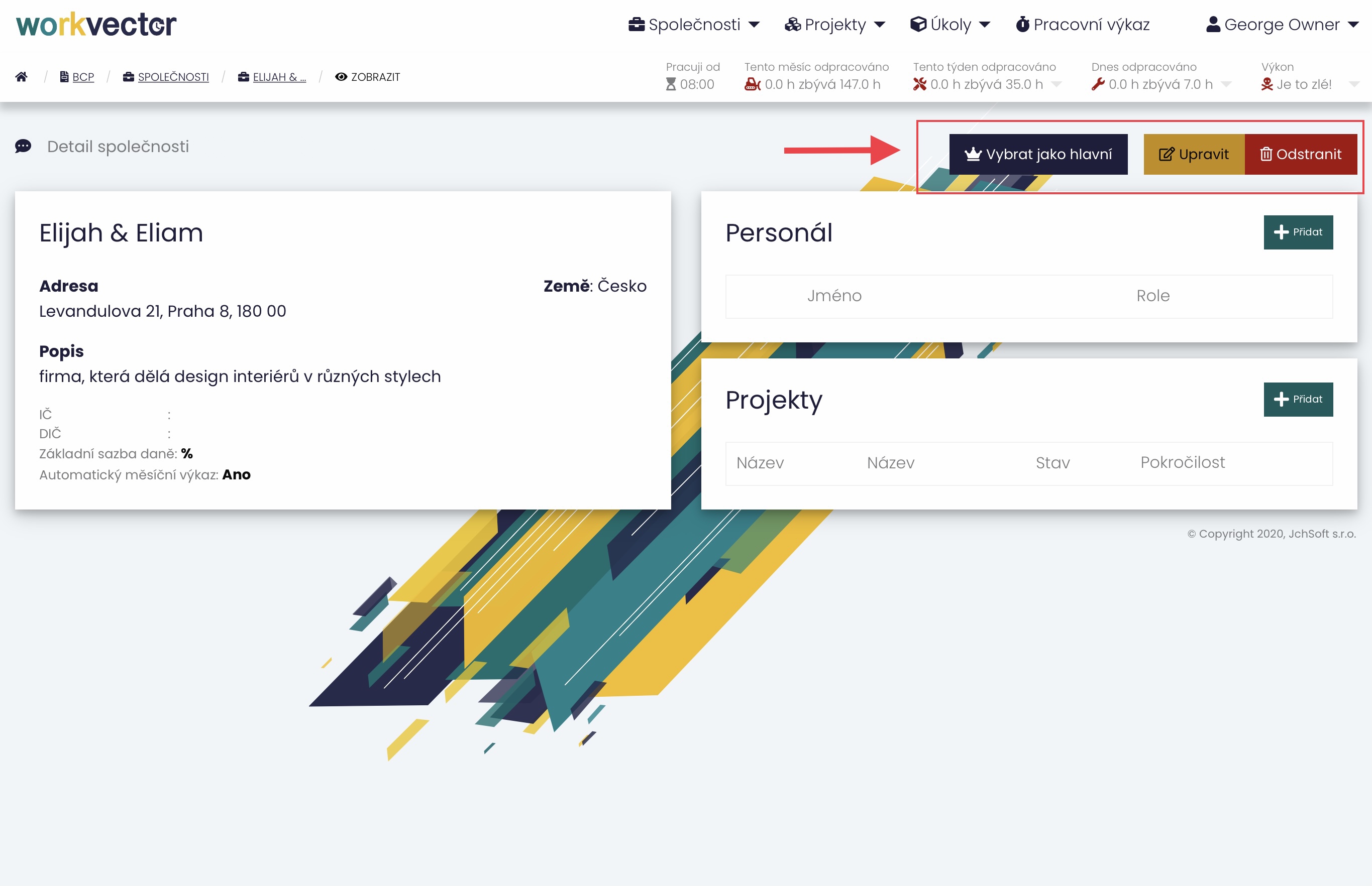 Společnost je možné Vybrat jako hlavní z již vytvořených společností, stejně také ji upravit, nebo Odstranit. Po vytvoření společnosti stačí přidat Personál a Projekty a vše je hotovo a Vaše firma je připravená trackovat čas a práci s WorkVectorem.