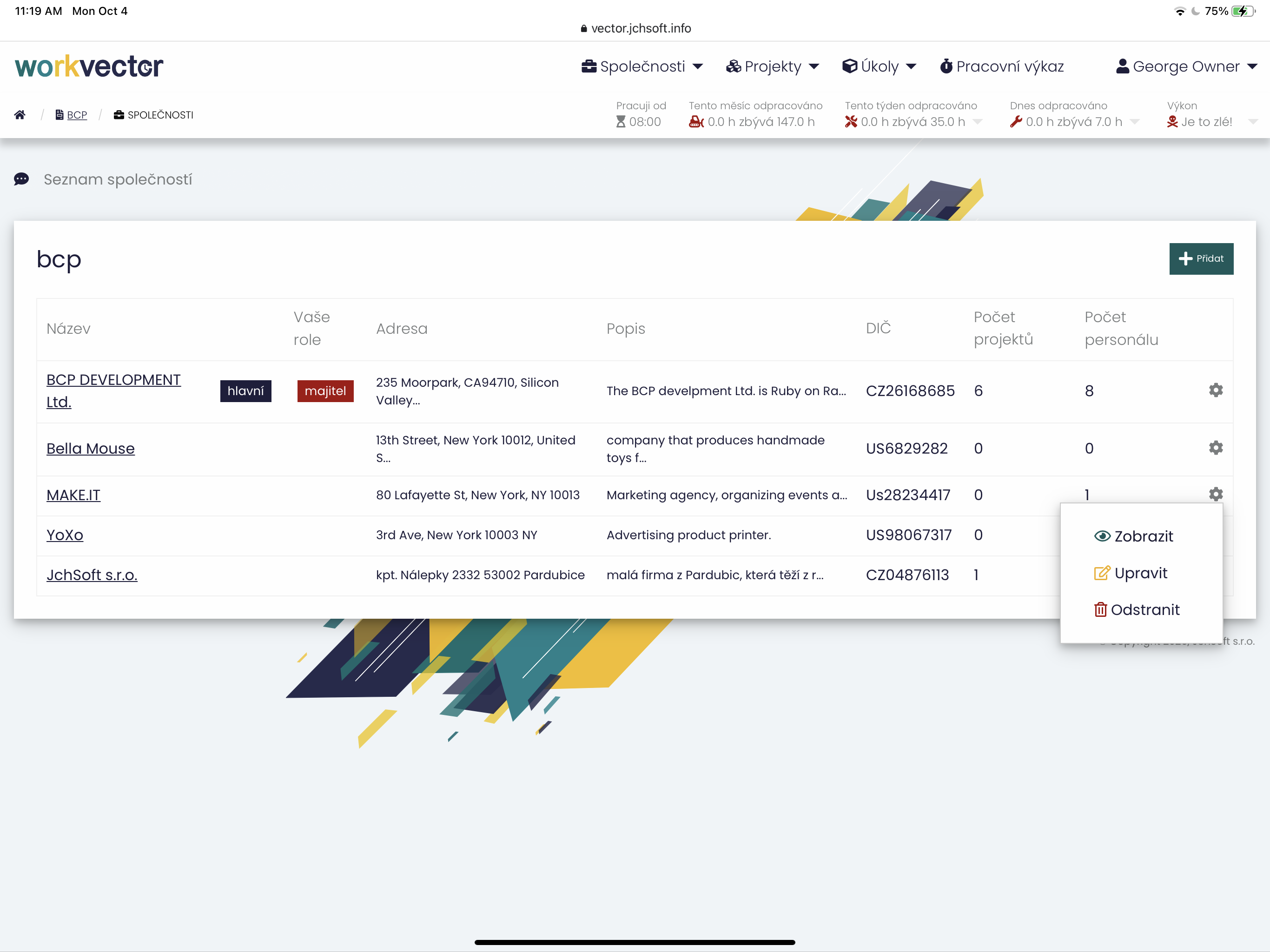 Po kliknutí na ikonu Společnosti, vyjede seznam společností, které jsou pod daným uživatelem. V seznamu je viditelný Název společnost, jaká je Vaše Role ve společnosti, Adresa společnosti, její Popis , DIČ , počet Projektů a Personálu dané společnosti. U každé jednotlivé společnosti je na pravé straně možné kliknout na kolečko, které umožní zobrazit danou společnost, upravit ji, nebo odstranit.