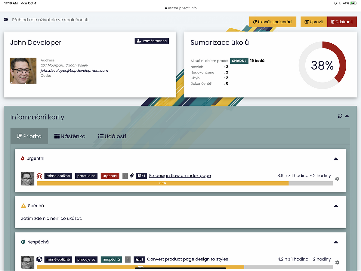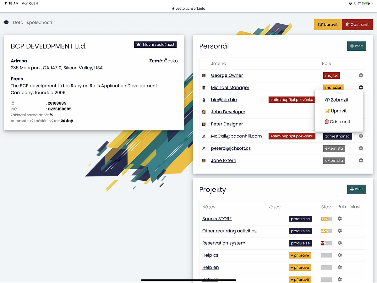 Při kliknutí na Zobrazit, vyjedou podrobné informace o dané firmě, seznam personálu s podrobnějšími informacemi (jméno, role). U personálu je možné přejít na jednotlivé profily, které zobrazí jejich informace, projekty a úkoly. Zároveň je možné přidat nebo odebrat uživatele ze seznamu personálu. V pravo dole se nachází seznam Projektů dané společnosti název, stav projektu a jeho pokročilost). Projekt taktéž lze zobrazit, upravit, či smazat.