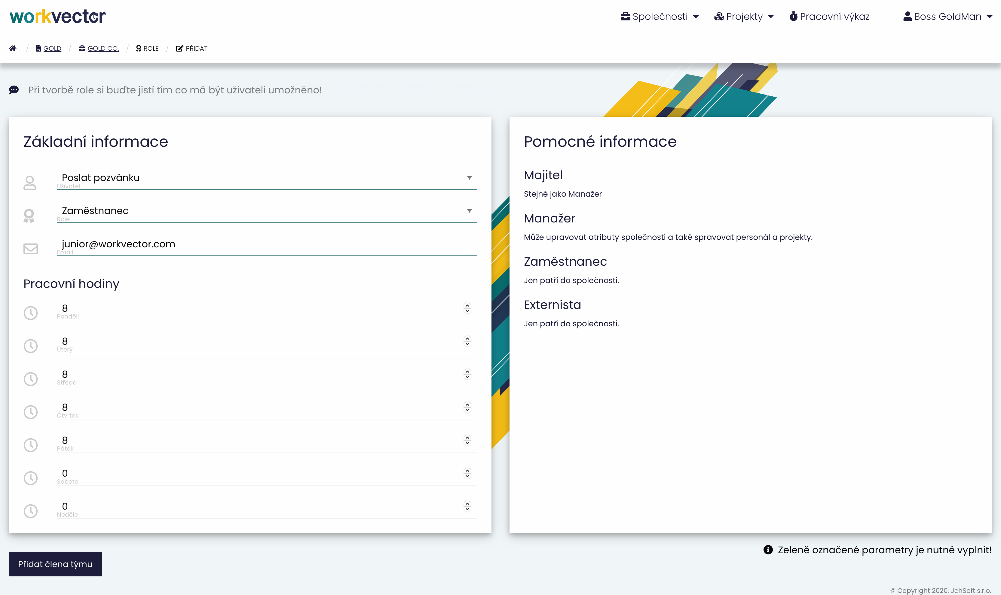 - Pro přidání nového zaměstnance je nutné se přihlásit do WorkVectoru.