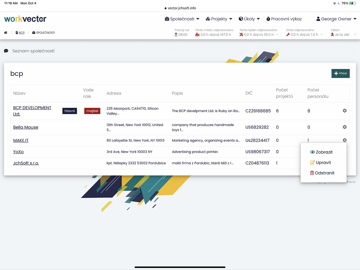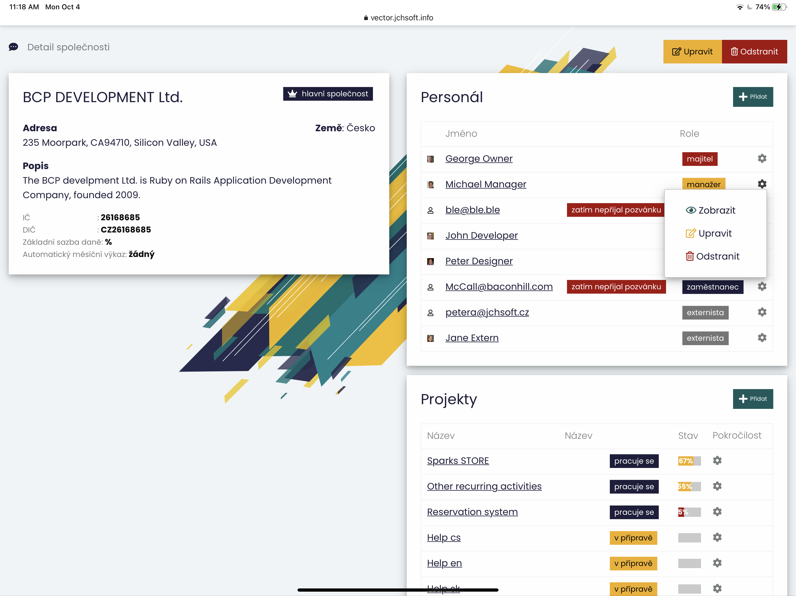 Po kliknutí na Zobraziť sa zobrazia podrobné informácie o danej spoločnosti, zoznam zamestnancov s podrobnejšími informáciami (meno, funkcia). V prípade zamestnancov môžete prejsť na jednotlivé profily a zobraziť ich informácie, projekty a úlohy. Je tiež možné pridať alebo odobrať používateľa zo zoznamu zamestnancov. V pravom dolnom rohu sa nachádza zoznam projektov daného názvu spoločnosti, stav projektu a priebeh projektu). Projekt môžete tiež prezerať, upravovať alebo vymazávať.