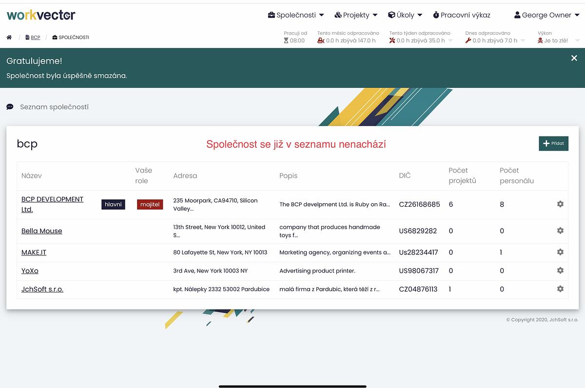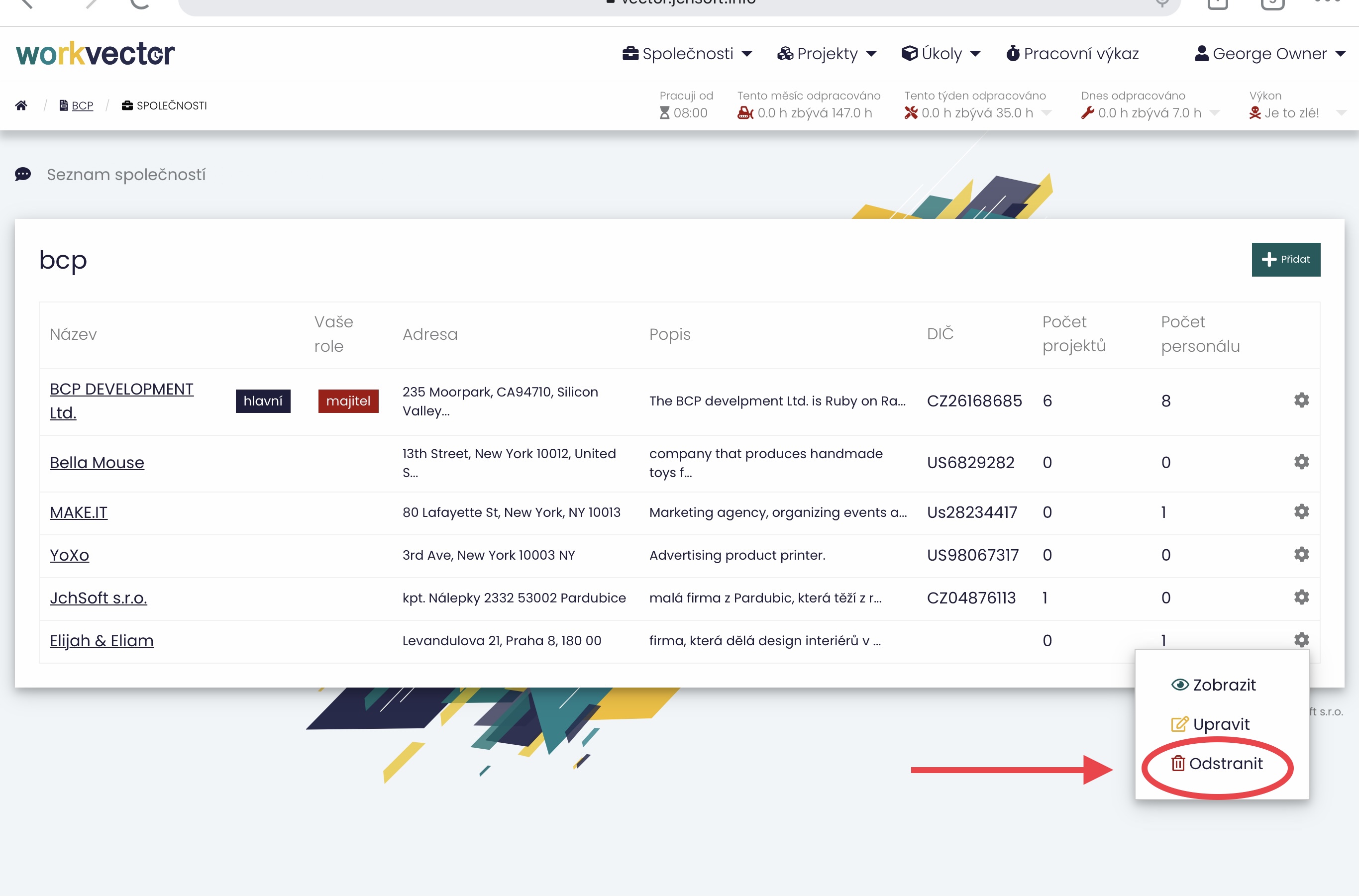 Ak chcete vymazať spoločnosť v systéme WorkVector, tento proces je veľmi jednoduchý. Prejdete na zoznam spoločností, ktorý nájdete na hornej lište. Tu nájdete zoznam všetkých spoločností. Najjednoduchšie to urobíte tak, že kliknete na koliesko v pravom rohu spoločnosti a zobrazí sa ponuka Zobraziť, Upraviť, Odstrániť. Po kliknutí na odstrániť sa zobrazí okno s otázkou WorkVectoru, či ste si týmto rozhodnutím istí, pretože spoločnosť nemôžete znovu vytvoriť, iba ju znovu vytvoriť. Kliknutím na tlačidlo Ok sa spoločnosť odstráni.