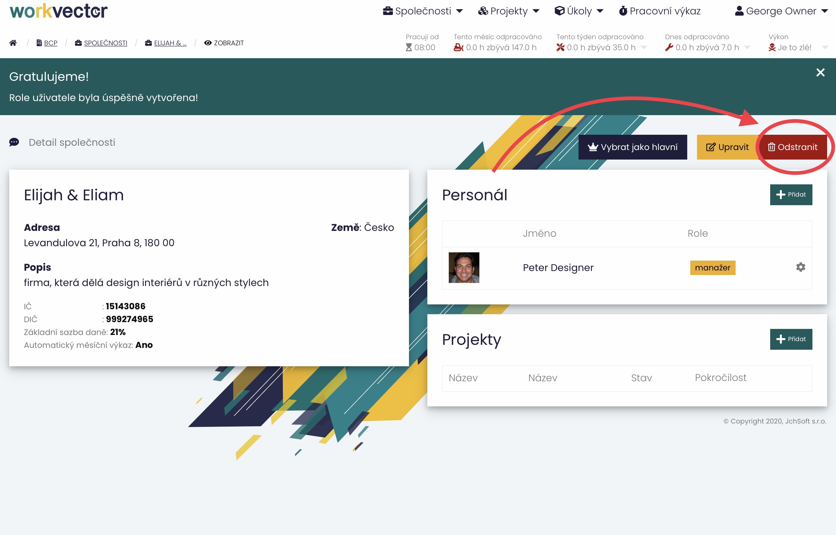 Druhý spôsob odstránenia spoločnosti je zrušiť kliknutie na ňu, čím sa dostanete do Podrobnosti o spoločnosti. Tu si môžete pozrieť všetky jej informácie, projekty a zamestnancov. V pravom hornom rohu sa nachádza tlačidlo odstrániť, ktoré umožňuje odstrániť celú spoločnosť. Po kliknutí na tlačidlo Odstrániť sa zobrazí aj okno s otázkou WorkVector, či ste si týmto rozhodnutím istí, pretože sa bude naďalej vracať. Po udelení súhlasu sa spoločnosť okamžite vymaže a vy môžete pokračovať v sledovaní času a práce.