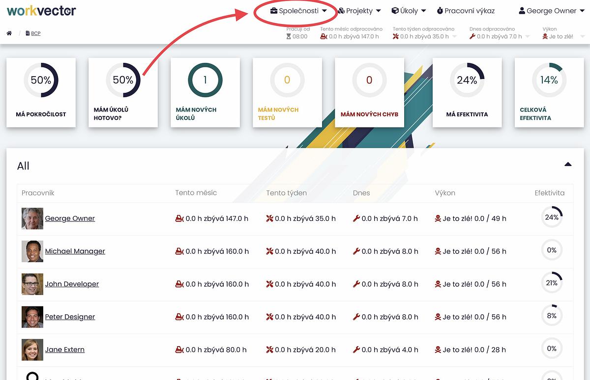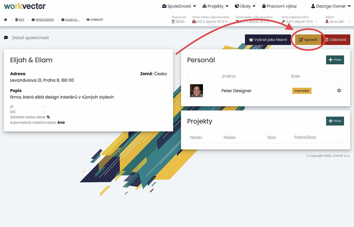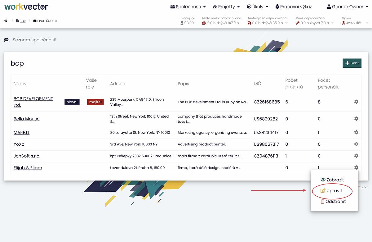 Spoločnosť môžete upravovať aj pri jej zobrazení. Tu nájdete podrobnosti o spoločnosti, jej projektoch a zamestnancoch. V pravom hornom rohu sekcie zamestnancov sa nachádza tlačidlo Upraviť, ktoré vás presmeruje na rovnaké kroky úprav ako v predchádzajúcom postupe.