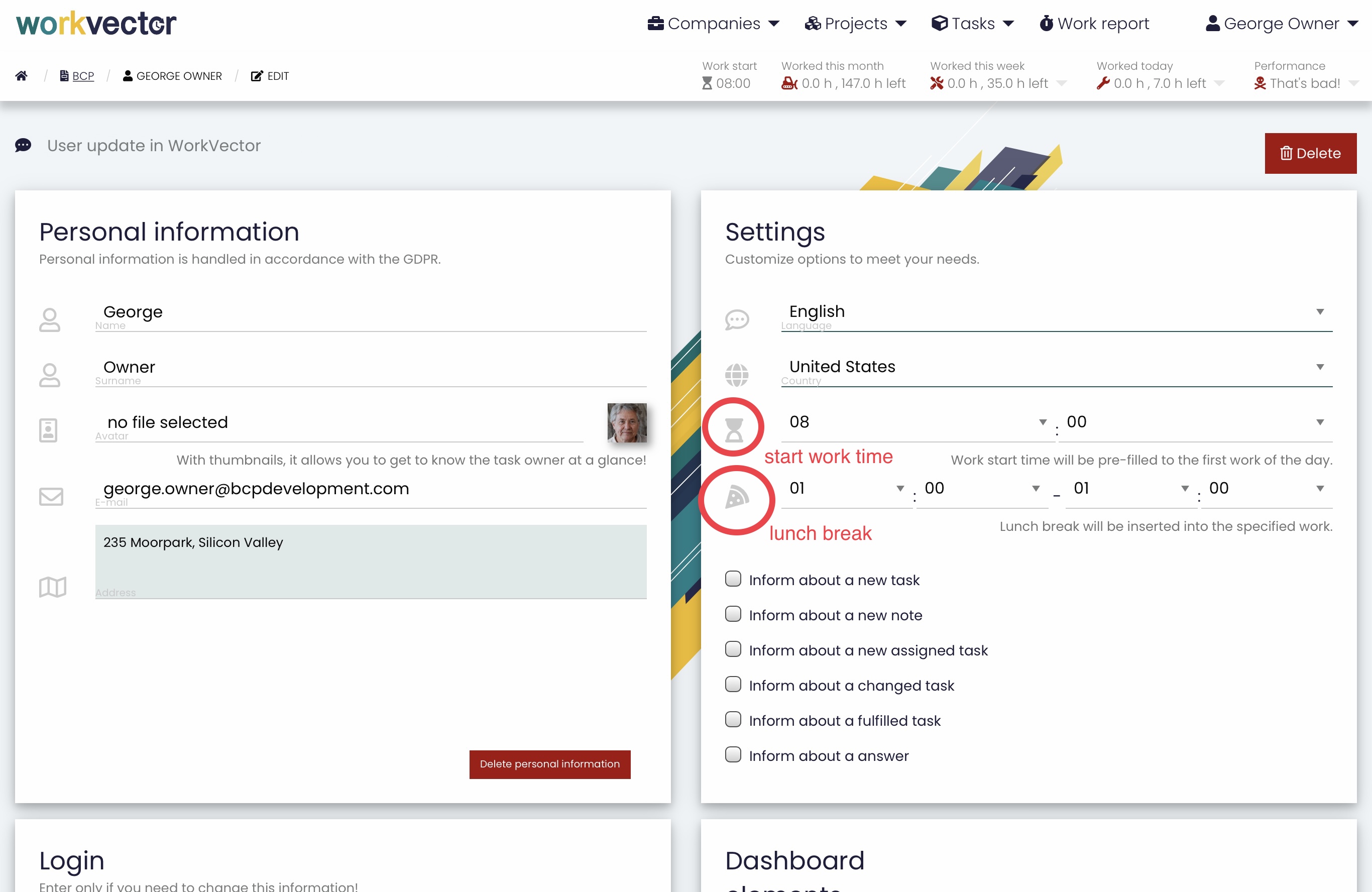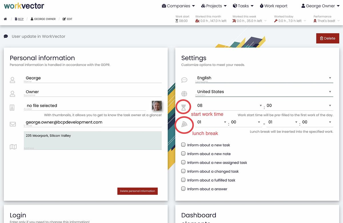 Work start time will be pre-filled by the first work of the day. This means that when you come to work (where you usually go regularly at the same time), WorkVector will use this time to complete the first job.