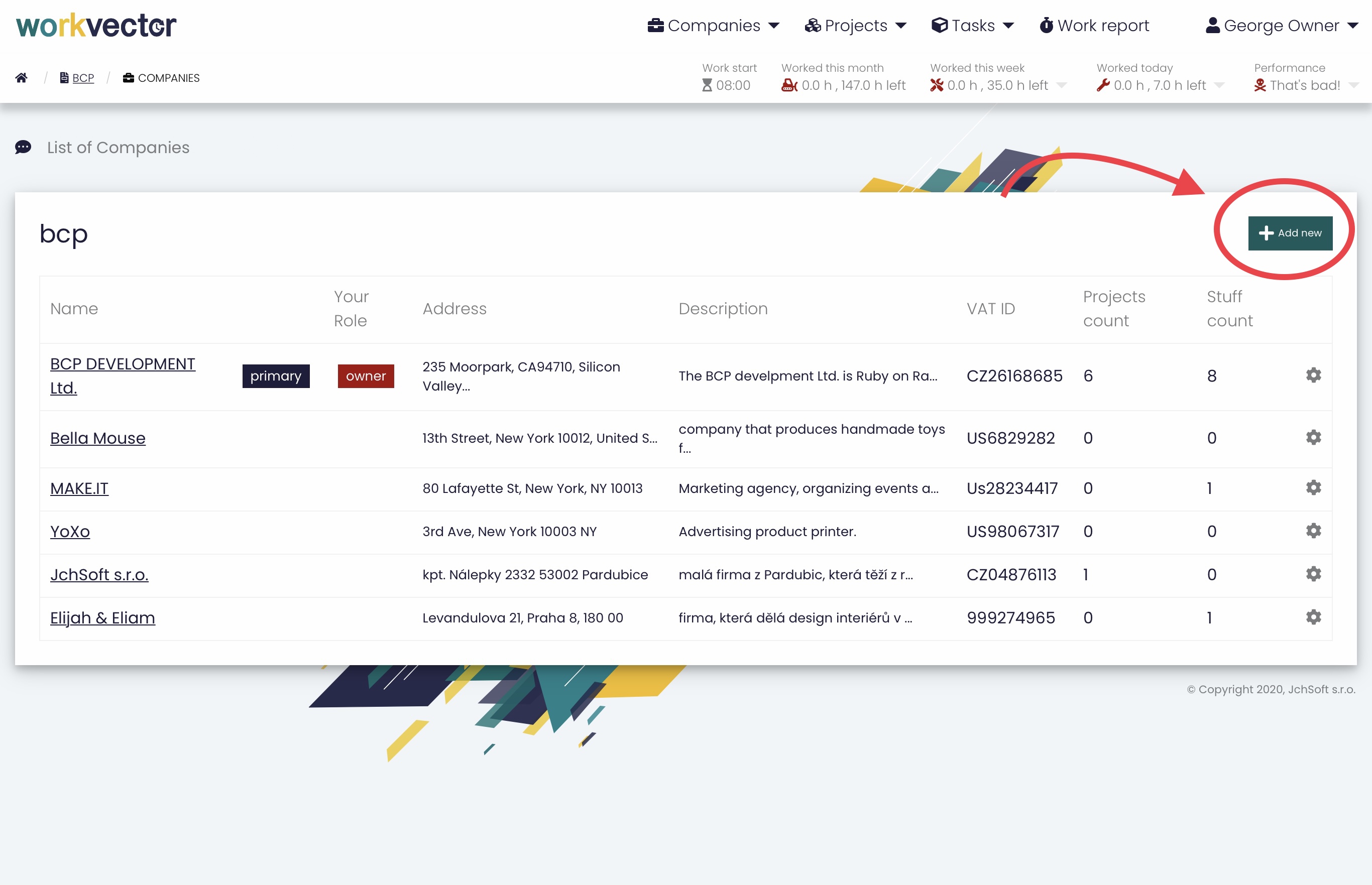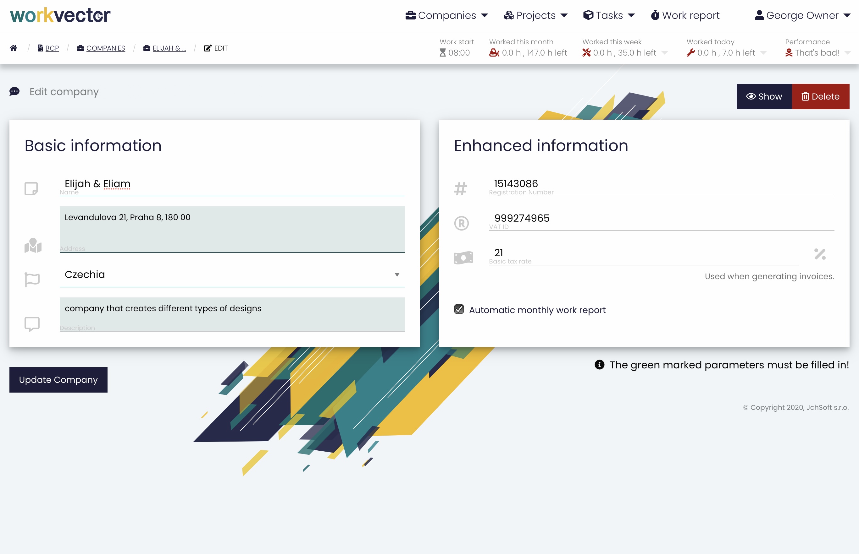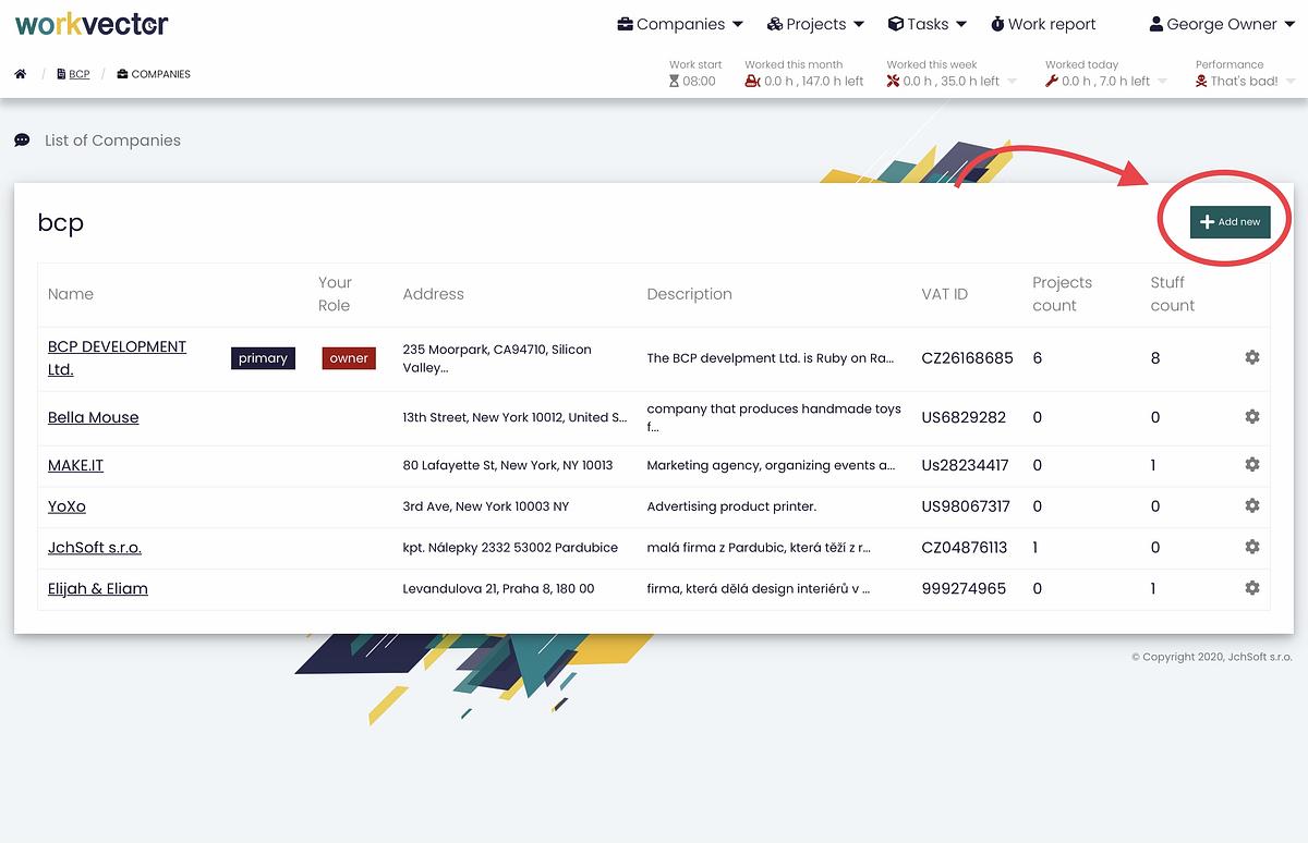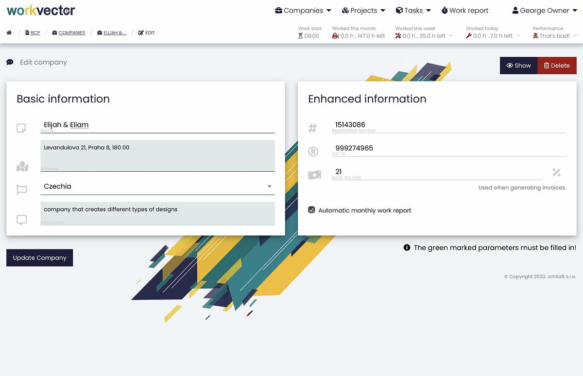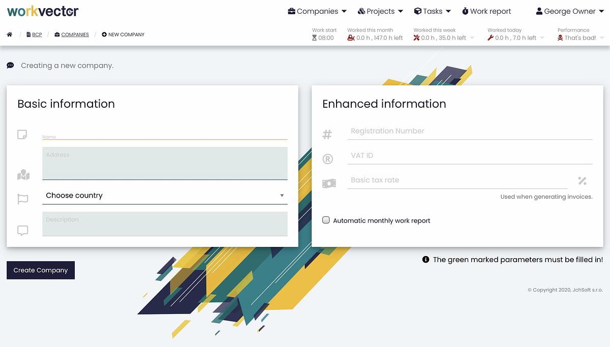In the Company report in the upper right corner, you can add a new company . When adding a new company, you need to fill in some Basic information, such as the Company name, its Address (which will be used when exporting to billing programs), Country of the company (the country of the company is filled in to determine VAT when invoicing), and its Description . For Enhanced information, it is necessary to fill in the Registration number (eight-digit identification number of the legal entity, natural person doing business, or organizational unit of the state), then VAT ID (tax identification number of the legal or natural person, which is a taxpayer, this number is used in the export or matching to check whether this company already exists) and the Basic tax rate. In the lower right corner there is an option to click on the Automatic Monthly Work Report, which is automatically generated every month. Then just click the Create Company button and you're done.