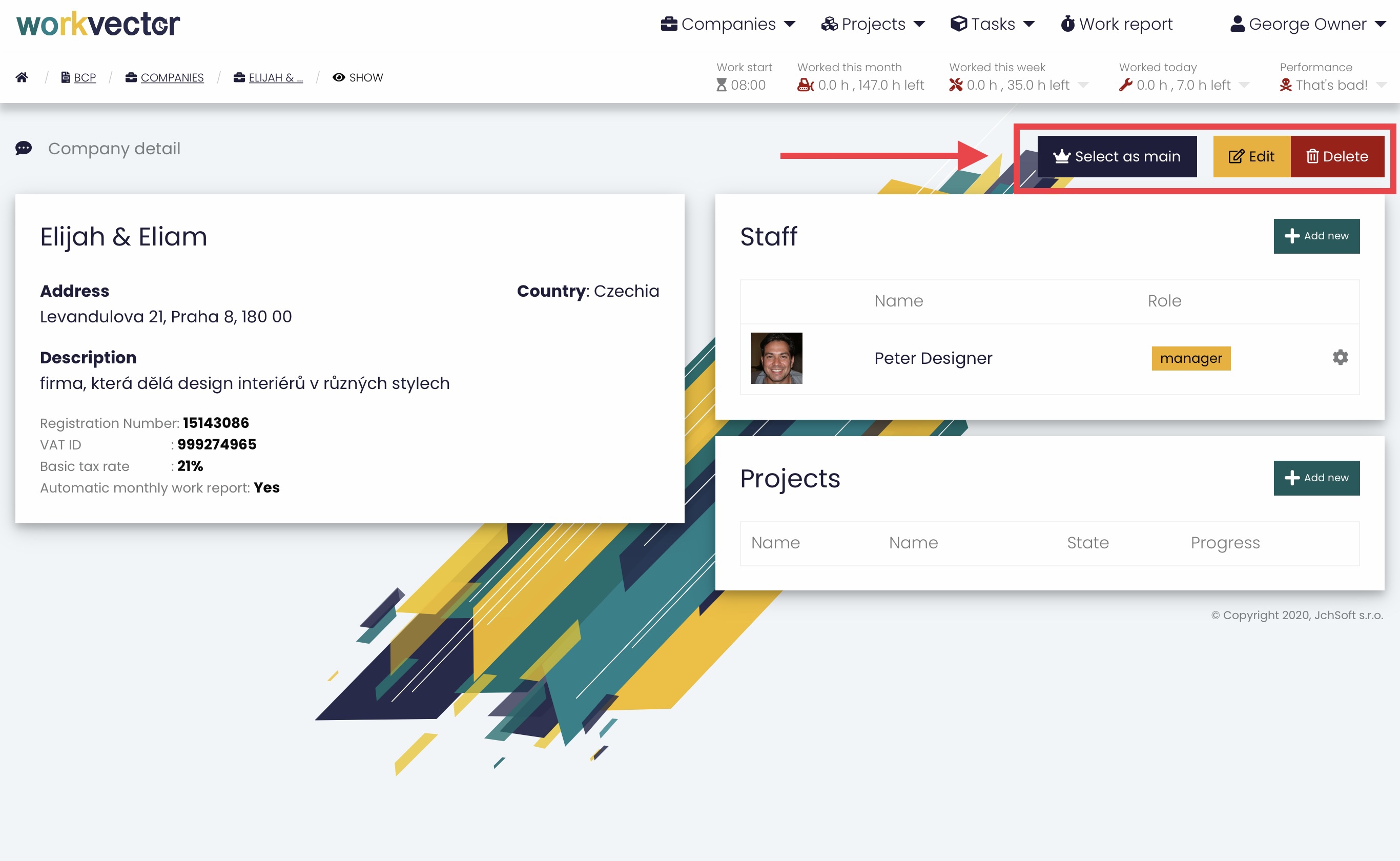 The company can be selected as the main of the already created companies, as well as edit or delete it. After creating the company, just add Personnel and Projects and everything is done and your company is ready to track time and work with WorkVector.