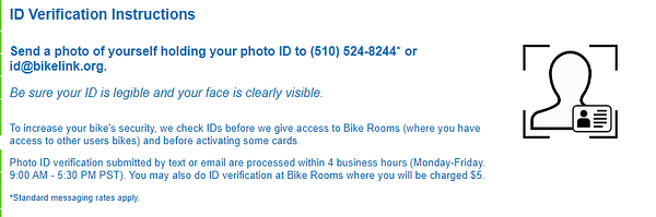 <p style="margin-top: 28px;">To increase your bike's security, we check IDs before we give access to Bike Rooms (where you have access to other users bikes) and before activating some cards.</p><p> Photo ID verification submitted by text or email are processed within 4 business hours (Monday-Friday. 9:00 AM - 5:30 PM PST). You may also do ID verification at Bike Rooms where you will be charged $5.</p>