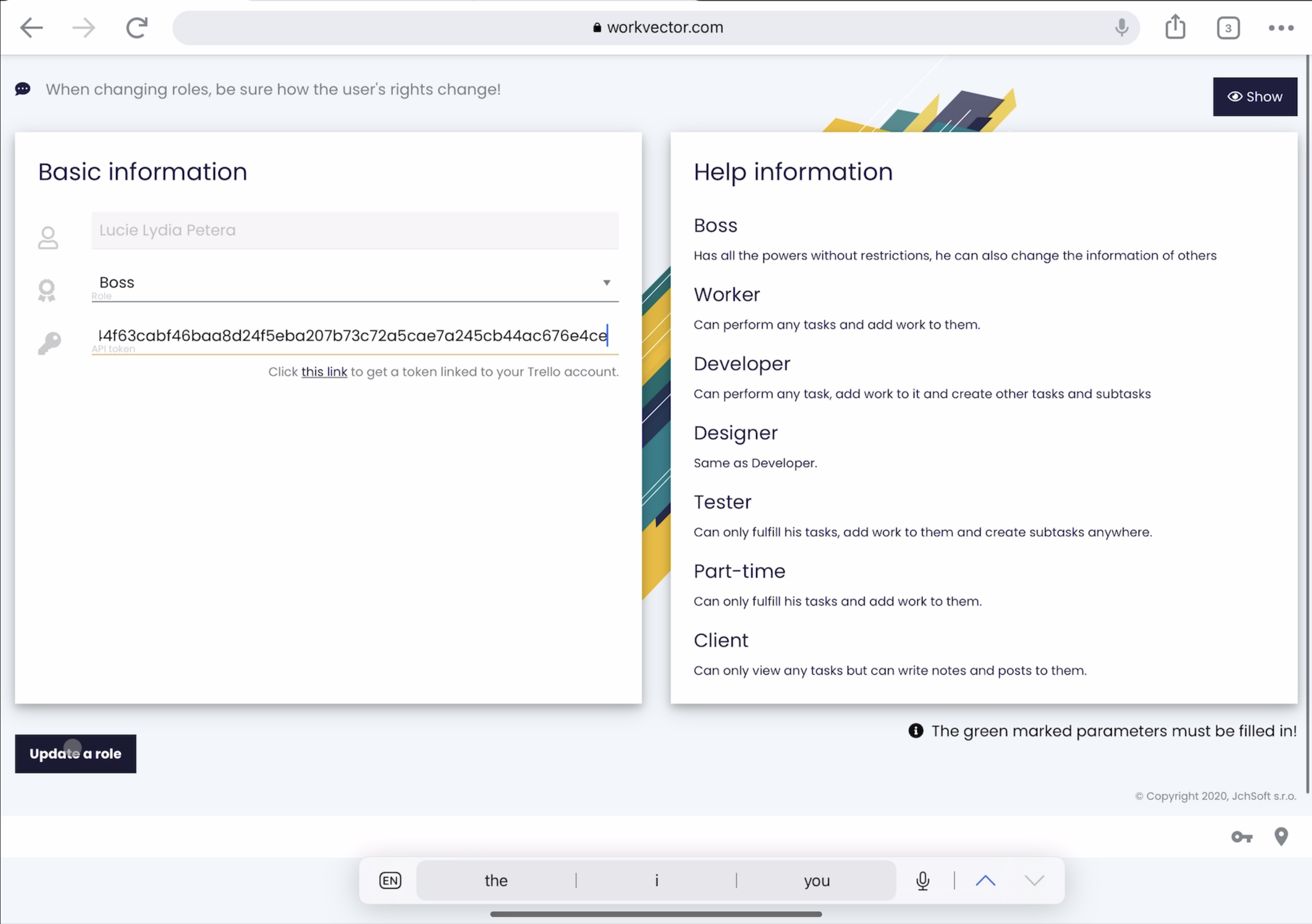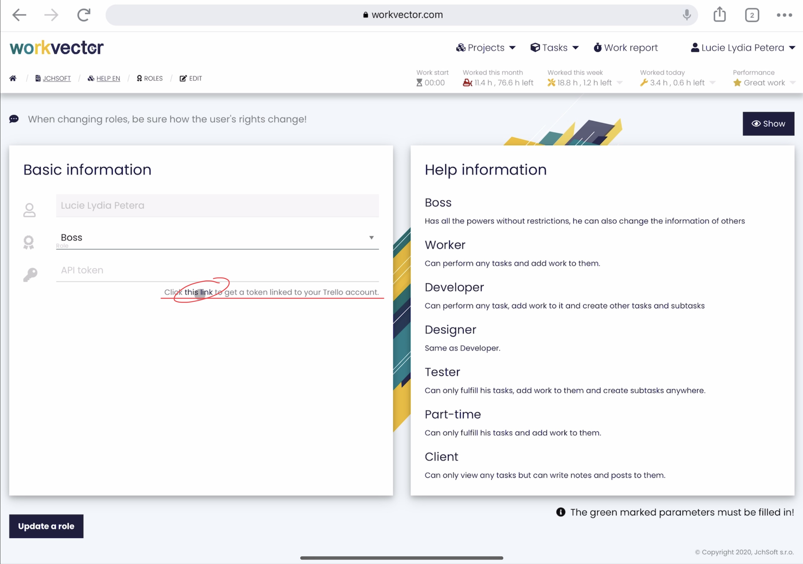 Najprv vykonáme nastavenie vo WorkVectore. Zvoľte si projekt, ktorý chcete prepojiť s Trello. Rozkliknite zoznam členov tímu a zvoľte úpravu svojho profilu. V základných informáciách je potrebné pridať API token. Pod posledným riadkom nájdete link, ktorý vás odkáže na stránku Autorizácia Trello, kde zídeme dole a zvolíte tlačidlo "Povoliť". Tým si vygenerujete váš API token, ktorý skopírujte a vložíte ho do API tokom riadka vo WorkVectoru a upgradujete svoju rolu.